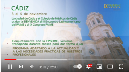 La Fundación para la Protección Social de la Organización Médica Colegial (FPSOMC) y el Colegio de Médicos de Cádiz organizan el IX Congreso Nacional del Programa de Atención Integral al Médico Enfermo (PAIME) y III Encuentro Latinoamericano del PAIME, bajo el lema “Cuidando de ti, cuidando de todos” que tendrá lugar del 3 al 5 de noviembre, en Cádiz. Para difundir el Congreso, el Colegio de Médicos de Cádiz ha lanzado un vídeo promocional, que fue presentado por el presidente y secretario de la corporación colegial, los doctores Juan Antonio Repetto y Gaspar Garrote, respectivamente, en la Asamblea de presidentes y Asamblea de secretarios del CGCOM