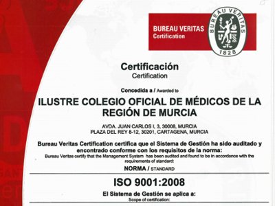 El Colegio de Médicos de la Región de Murcia ha recibido la renovación de su Certificado en base a la Norma de Calidad ISO 9001:2008, tras someterse al proceso de auditoría por la Entidad de Certificación Bureau Veritas durante el pasado mes de octubre en sendas sedes colegiales de Murcia y Cartagena.