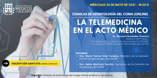 La Comisión de Deontología del Colegio de Médicos de Alicante (COMA) retoma las Charlas de Deontología online centrando el análisis y el debate en ‘La telemedicina en el acto médico’. La jornada se celebrará el próximo miércoles 26 de mayo, a las 18.00 h, y para su asistencia es necesaria inscripción previa